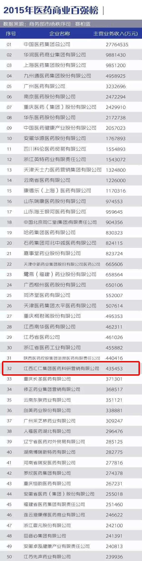 同時,商務(wù)部發(fā)布了《2015年醫(yī)藥商業(yè)百強榜》,匯仁醫(yī)藥榮獲百強榜第32位。